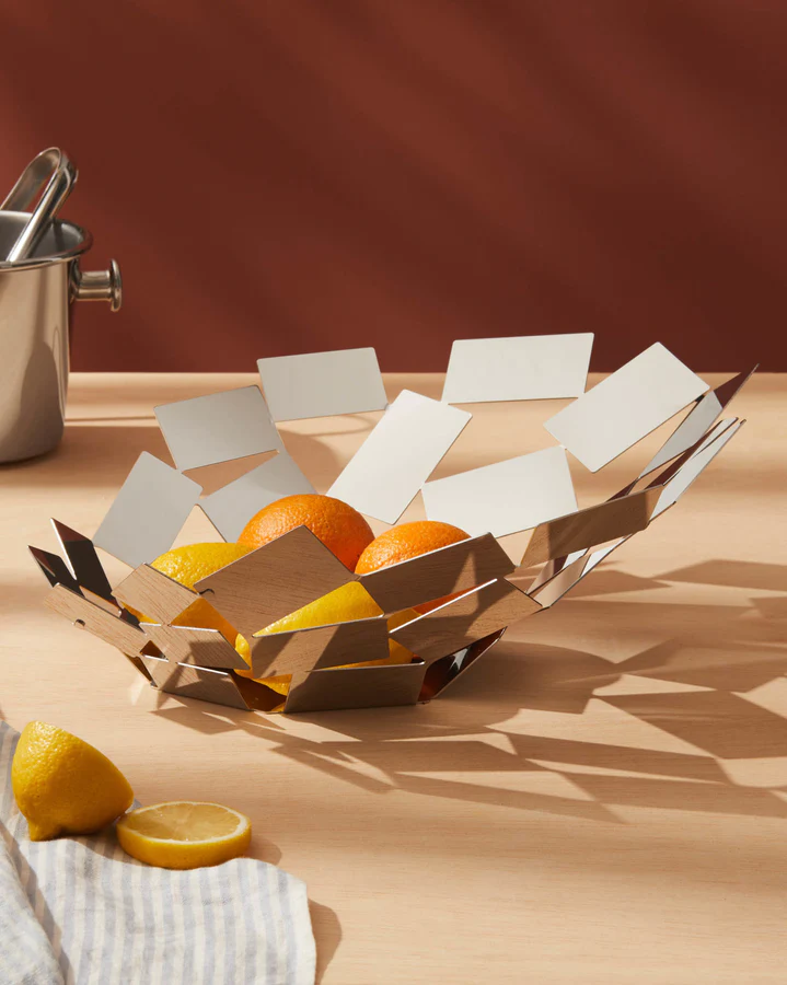 “La Stanza dello Scirocco” è una famiglia di oggetti che nasce attorno all’atmosfera astratta e immobile di un luogo magico: la stanza dove si è costretti a stare per ripararsi dall’afa, nelle vecchie grandi case di campagna in Sicilia, aspettando che lo scirocco si plachi. Ne è risultata una collezione di oggetti dalle geometrie aritmiche, composti da piccole schegge di dimensioni diverse, unite fra loro per punti in equilibrio instabile.