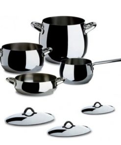 Contiene: Pentola (SG100/20), Casseruola a due manici (SG101/20), Casseruola bassa a due manici (SG102/24), Casseruola a manico lungo (SG105/14), Lid (SG200/14), Coperchio (SG200/20), Coperchio (SG200/24). Fondo in acciaio magnetico adatto anche alla cottura a induzione.