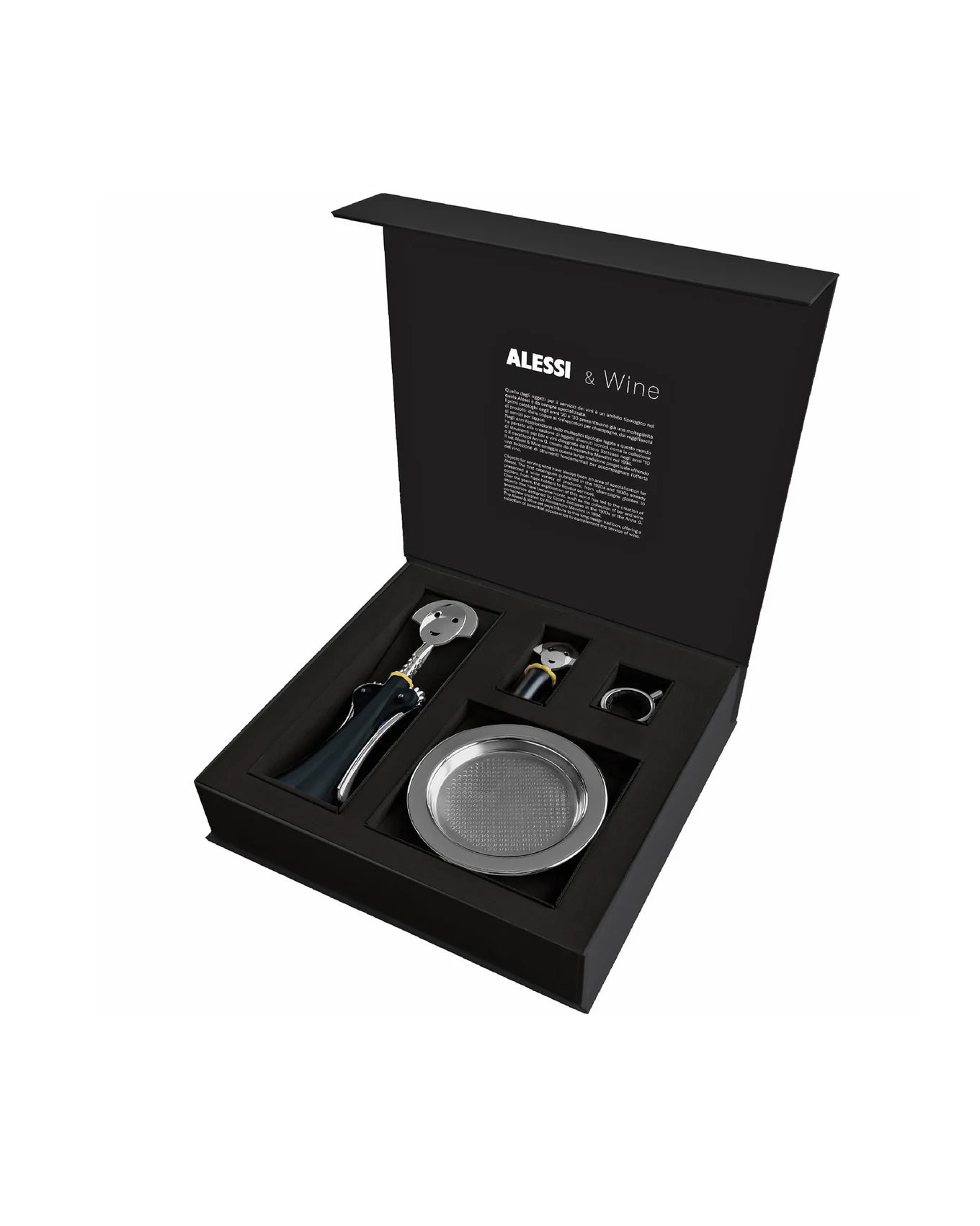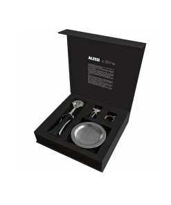 La ricerca di Alessi nel campo delle tipologie per il servizio del vino, ha portato negli anni l’azienda a creare oggetti ormai divenuti iconici, che hanno ampliato l’immaginario legato a questo mondo. Questo set compone quattro tipologie fondamentali per ogni sommelier: il cavatappi Anna G. e il tappo Anna Stop 2, disegnati da Alessandro Mendini, il salvagoccia Noè di Giulio Iacchetti e il sottobottiglia 5009 di Ettore Sottsass.