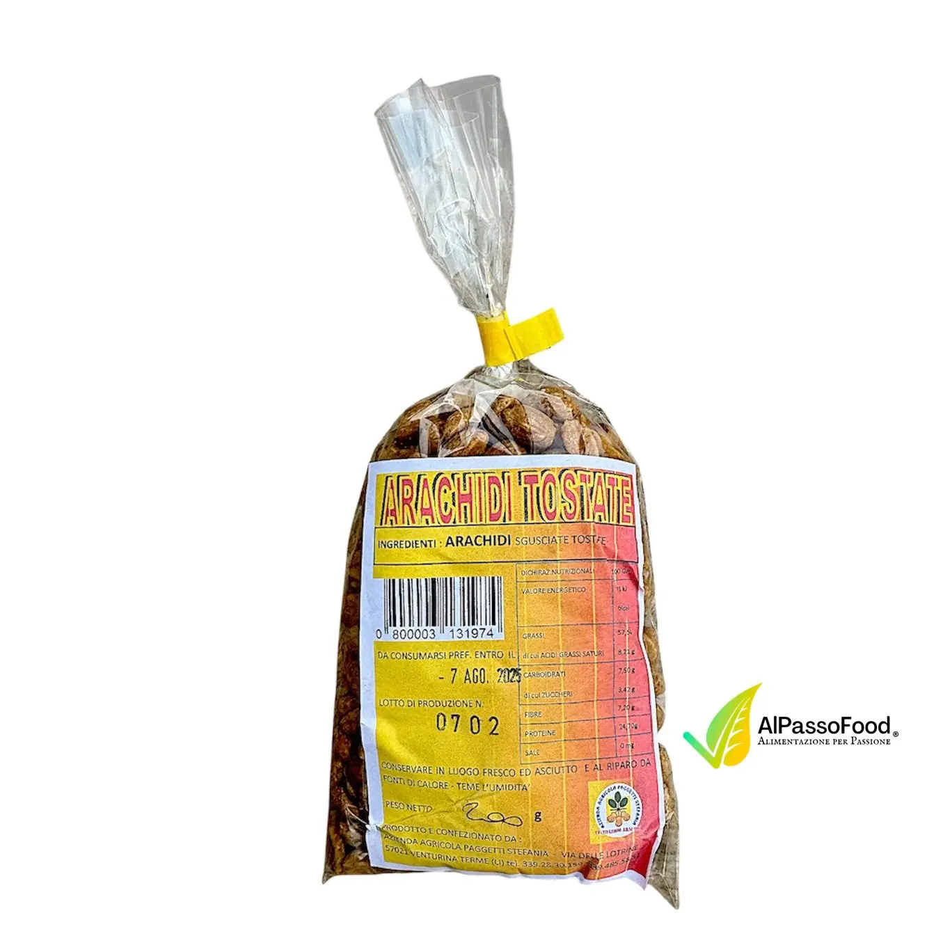 Coltivate con cura nei nostri campi della Val di Cornia, queste arachidi sono il risultato di una filiera corta e controllata, dalla semina al raccolto, dalla tostatura al confezionamento.