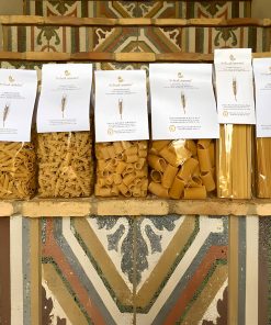 La pasta di semola di frumento duro monograno varietà Marco Aurelio, trafilata al bronzo ed essiccata a bassa temperatura, è pastificata artigianalmente con l’acqua pura dell’acquedotto dei Monti Sibillini e con la semola prodotta dal grano duro coltivato a SelvaGiurata.