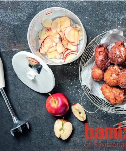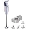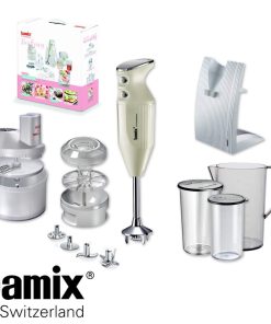 Dotato di due velocità, come tutti i modelli Bamix, è caratterizzato da una impugnatura invertita che consente di azionare i tasti (in gomma antiscivolo) con il pollice mentre le altre quattro dita tengono il frullatore ben saldo.