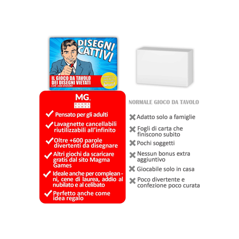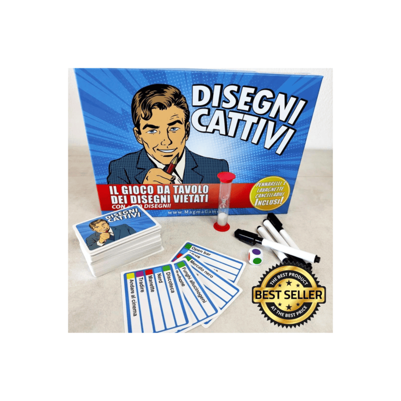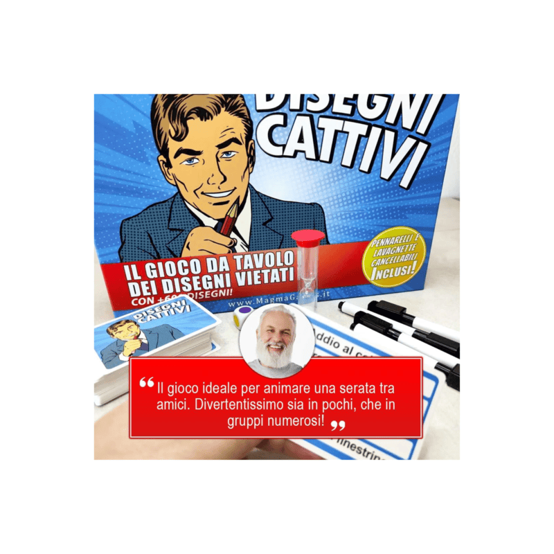 Siete pronti a liberare la vostra creatività… e a bere un po’? Disegni Cattivi è il gioco da tavolo di Magma Games che vi farà divertire come matti tra disegni assurdi, parole imbarazzanti e risate a crepapelle. Un gioco perfetto per serate con amici adulti, feste e addii al celibato/nubilato!