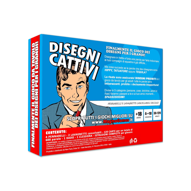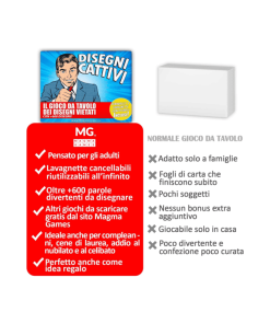 - Gioco di società per adulti: Disegni Cattivi è un gioco pensato esclusivamente per un pubblico adulto. Le parole e le sfide contenute al suo interno non sono adatte ai minori.