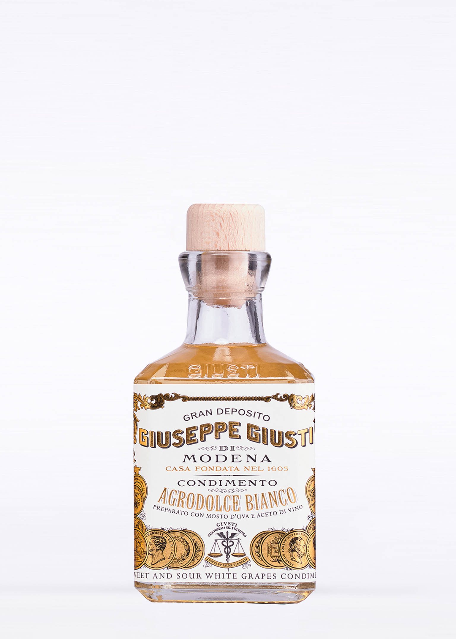 L’expertise centenaria di Acetaia Giusti, nella produzione dell’Aceto Balsamico, l’attenzione posta nella selezione delle materie prime, ha permesso di sperimentare e ampliare la collezione dei condimenti Giusti, realizzando altri prodotti a base acetica, come l’Agrodolce Bianco. Perfettamente in linea con lo stile Giusti, ogni prodotto si distingue per l’inconfondibile gusto agrodolce che caratterizza tutti i balsamici della casa.