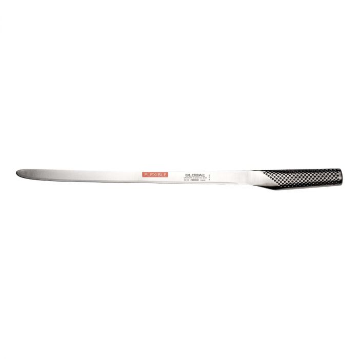 La G-10 è un’affettatrice per salmone specializzata. Ha una lama flessibile molto lunga e sottile che lo rende adatto solo a questo scopo. Questi coltelli sono tipicamente usati per tagliare pezzi di salmone affumicato o trota, le lame sono ideali per affettare pezzi lunghi e sottili, che è il modo in cui viene tradizionalmente presentato il salmone affumicato. Il manico è lo stesso degli altri coltelli della serie G ed è comodo da impugnare. C’è uno spazio di circa un pollice dal manico dove la lama non è affilata per fornire un po ‘di protezione. Questa è la lama più lunga che Global produce e come tale non si adatta a nessuno dei blocchi e sarebbe anche una seccatura da mettere in un cassetto. Idealmente deve essere posizionato su un supporto magnetico.