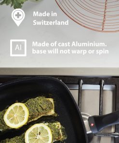 Qualità garantita da Swiss Diamond HD: Swiss Made, realizzata in alluminio fuso riciclato per una distribuzione uniforme del calore, rivestimento antiaderente rinforzato con polvere di diamante che consente di cucinare senza condimenti.