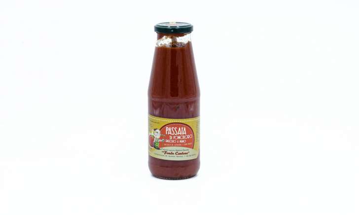 La passata viene realizzata esclusivamente con i pomodori coltivati nel campo dell’azienda. La raccolta viene eseguita a mano per selezionare i pomodori migliori che vengono messi in cassette, così rimangono integri e possano perfezionare la maturazione per alcuni giorni. La lavorazione artigianale si conclude con la cottura a Bagnomaria come si faceva una volta. Gli ingredienti sono soltanto due: Pomodoro e sale. Infatti è il raccolto che regala i suoi profumi, i suoi sapori e tutta la sua freschezza.