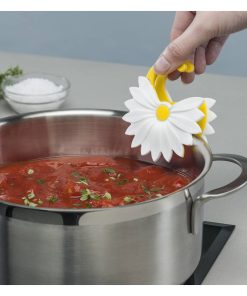 Agganci la margherita al bordo della pentola ed agganci il cucchiaio senza sporcare il piano lavoro.
