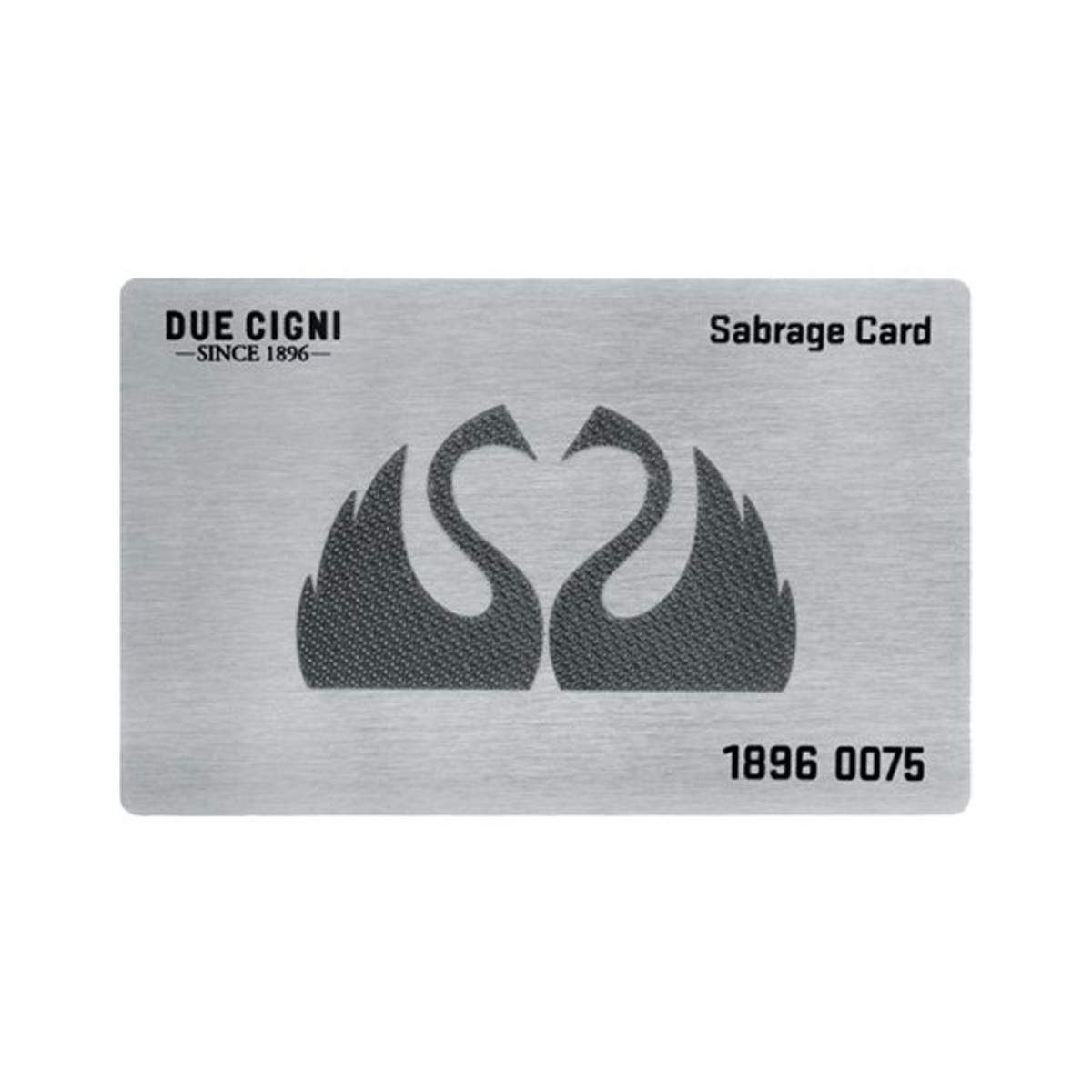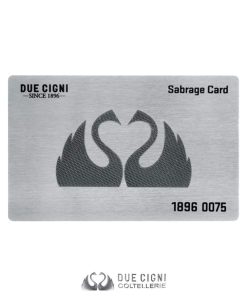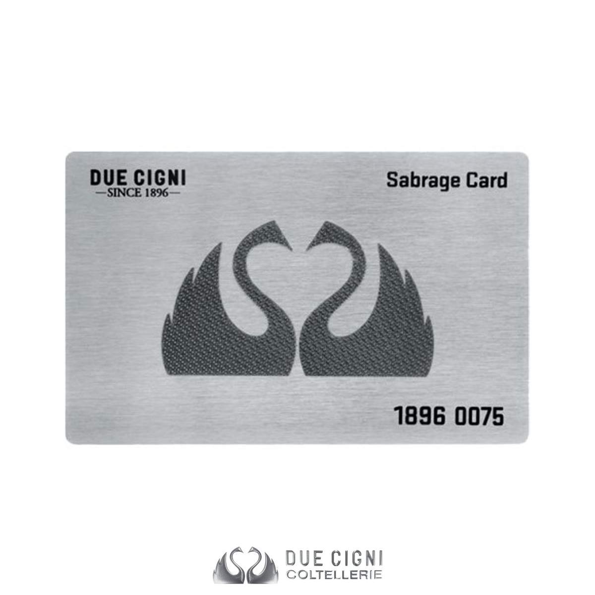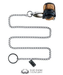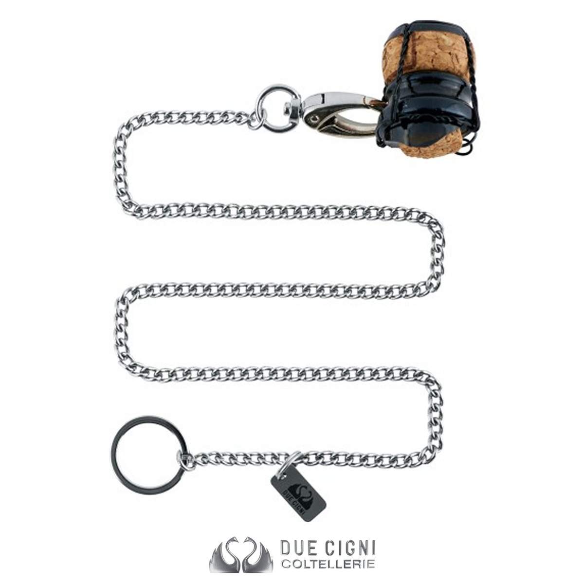 Completamente in acciaio inox AISI 420 è dotata di catenella e moschettone per ancorare il tappo una volta stappato, mentre al centro presenta il logo Due Cigni realizzato per aumentare il grip durante la fase del sabrage ed impedire che la tessera possa scivolare.