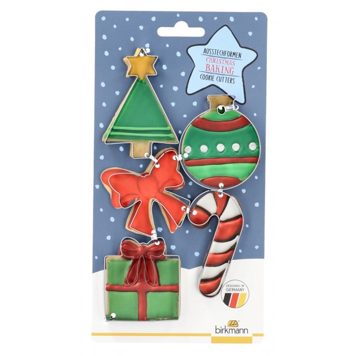 Set 5 Stampini in acciaio inox per Biscotti di Natale – albero di Natale, fiocco, pacco regalo, palla di Natale, bastoncino di zucchero