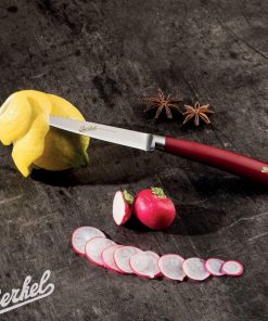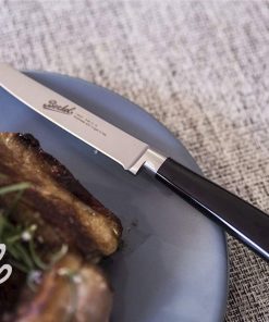 La lama, grazie alla punta e alla sua affilatura, consente di tagliare la carne in modo preciso, limitando le rotture e gli sfilacciamenti. Il manico realizzato in resina acetilica conferisce un aspetto lucido e molto riconoscibile del marchio che è presente in colorazione dorata anche sul fondo della manicatura.