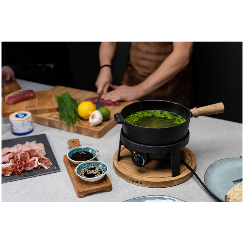 La pentola si riscalda da sola: la pentola elettrica per fonduta in ghisa, con rivestimento antiaderente in smalto, ha una capacità di 2,15 litri. Grazie al rechaud con pratica regolazione della temperatura, troverete sempre la temperatura ideale per la vostra serata fondue. L’apparecchio mantiene la temperatura selezionata e garantisce ore di divertimento spensierato senza pensare a gel riscaldanti.