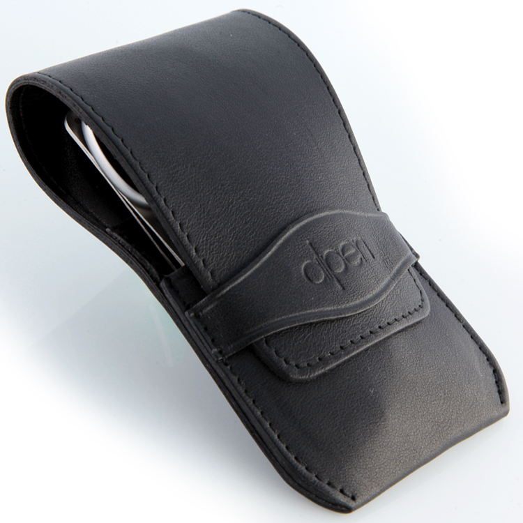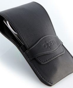 L’astuccio in pelle nera si chiude con una comoda patellina.