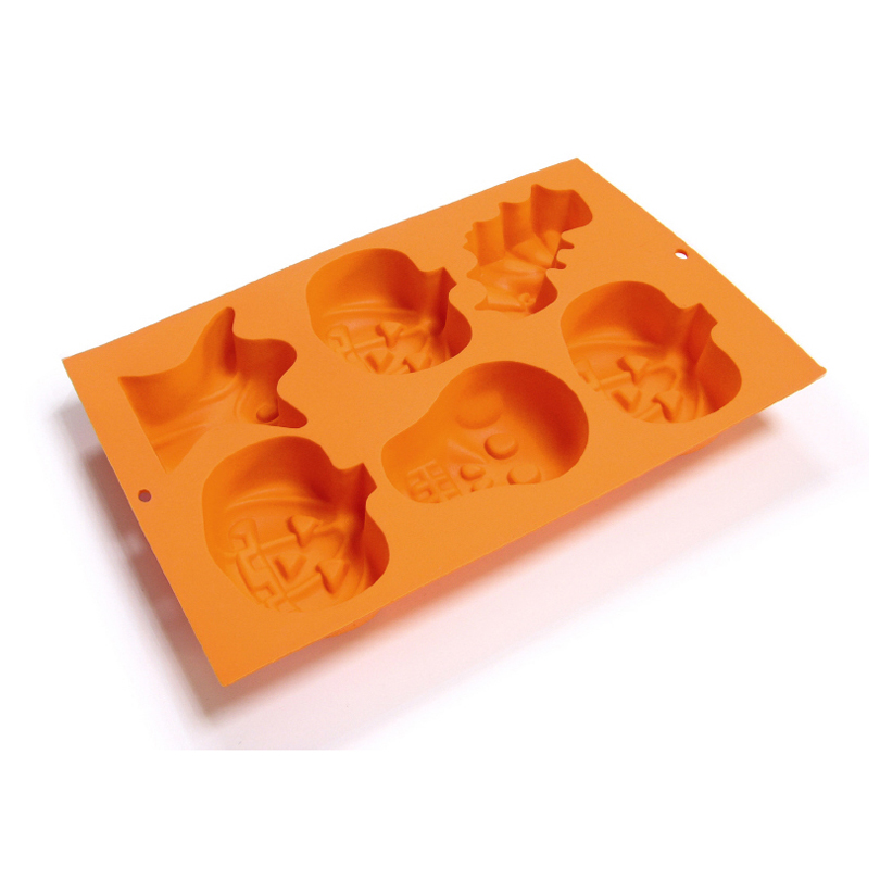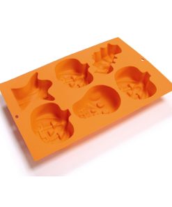 Lo stampo in silicone consente di realizzare 6 dolcetti dedicati ad Halloween: 3 zucche, fantasma, teschio e pipistrello)