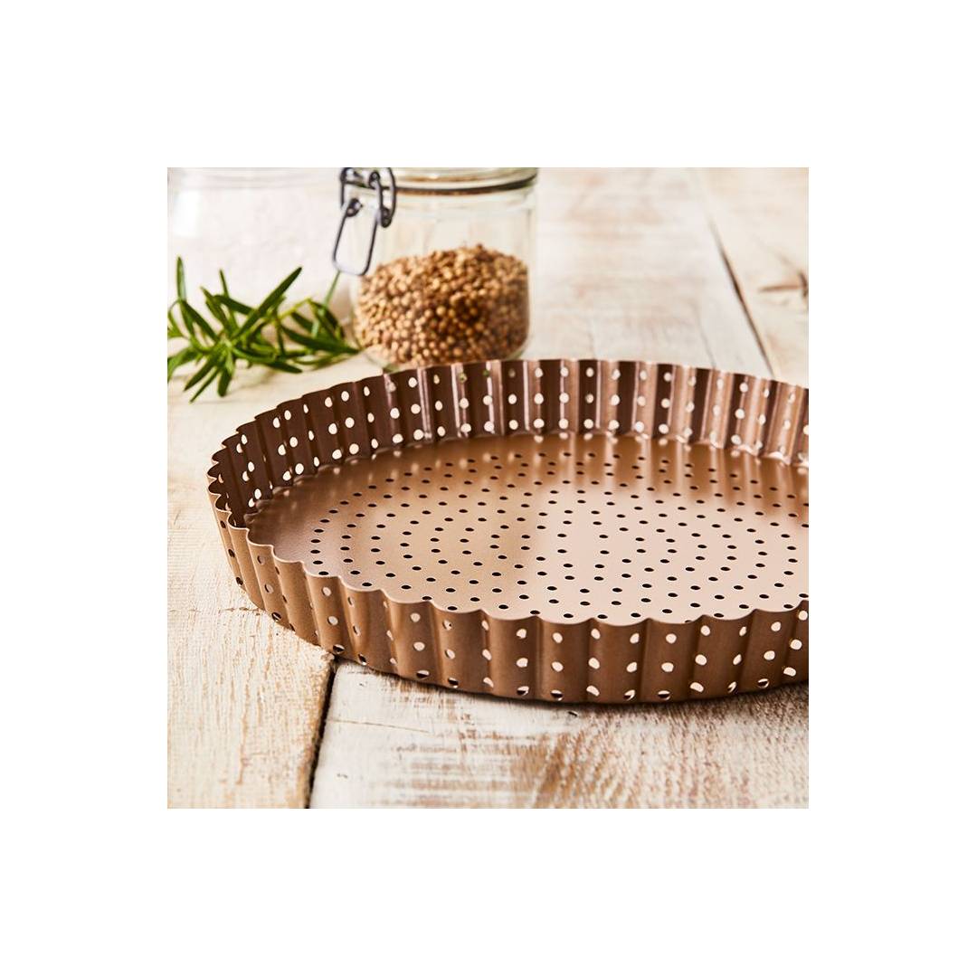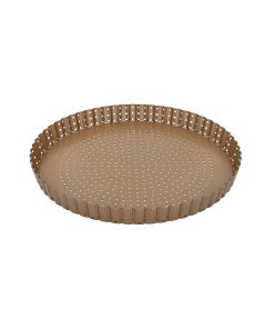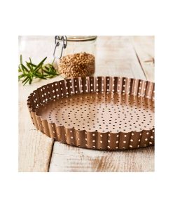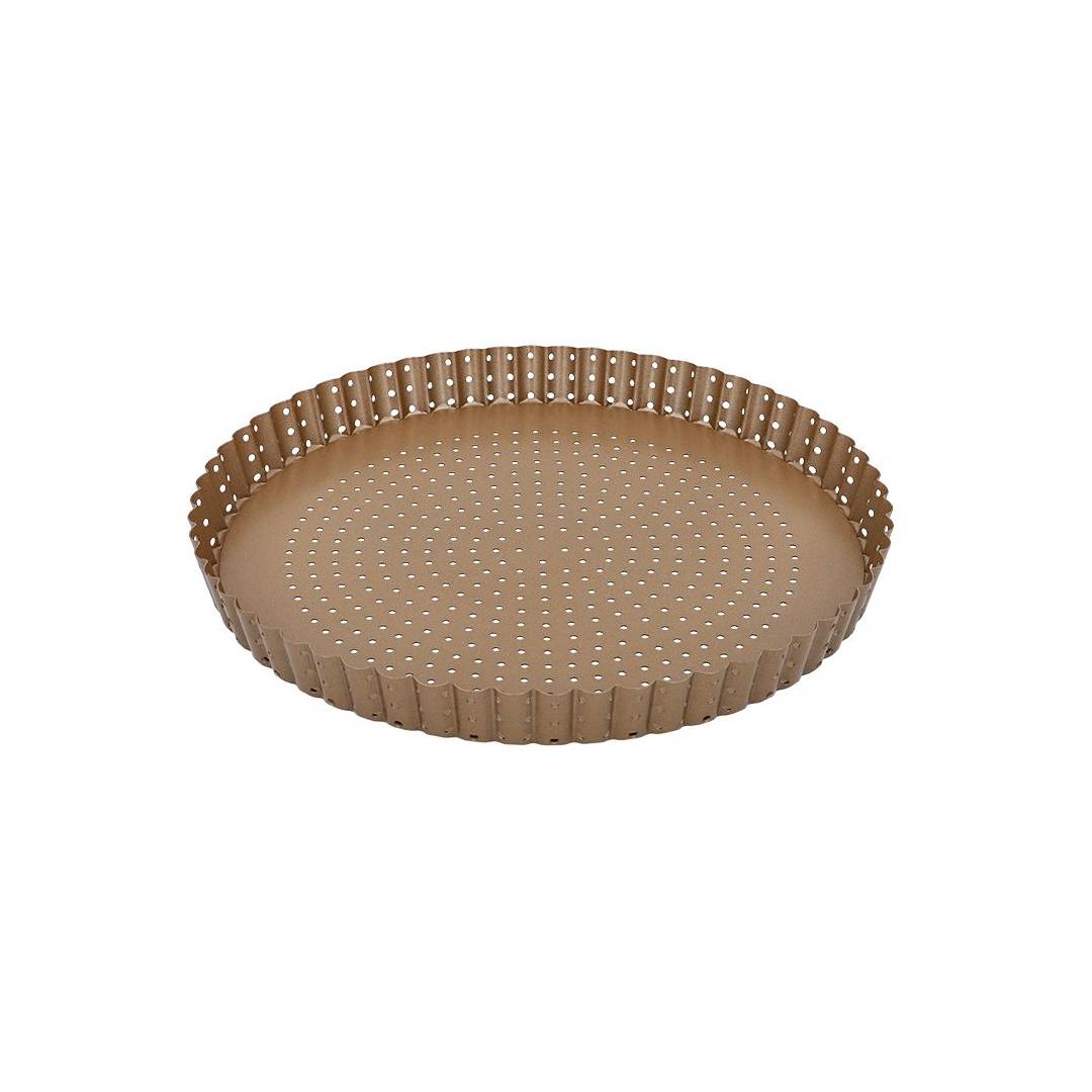 Teglia forata per realizzare croccanti crostate, torte salate, pizze e quiches. Il fondo è libero per rendere facile l’estrazione dallo stampo della torta, anche quelle particolarmente friabili.