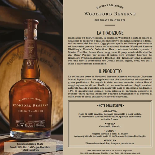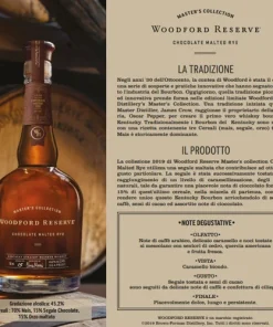 Il Whiskey Woodford Reserve Chocolate Rye viene venduto in bottiglie da 70 cl e viene presentato in un elegante astuccio, che lo rende perfetto per un regalo speciale o per una serata di degustazione con gli amici.