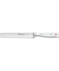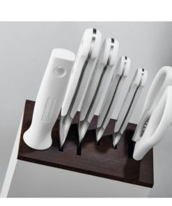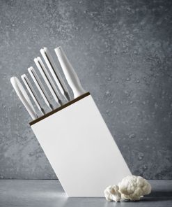 Il blocco portacoltelli bianco include 6 utensili premium di alta qualità. Il corpo piatto e obliquo consente di prelevare e reinsere i coltelli con un unico, pratico movimento. Il robusto leggo di faggio termolavorato fa di questo oggetto di design anche un prodotto sostenibile.