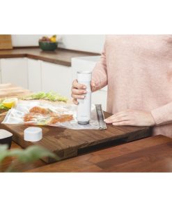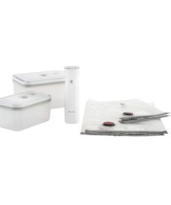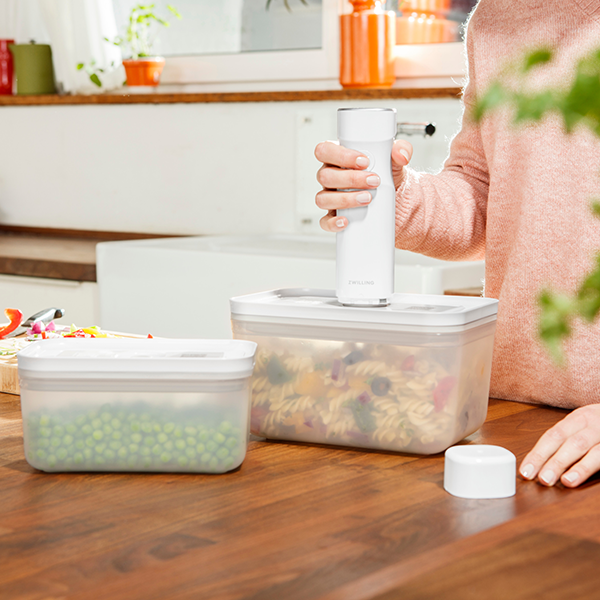 Il set adatto per iniziare un’alimentazione sana e sostenibile Il set in plastica è l’opportunità per mettere finalmente in pratica le buone intenzioni. Mangia in modo genuino e sano, risparmia tempo, soldi e butta meno cibo nella spazzatura! Ecco come fare: compra tutti i prodotti freschi che vuoi e conservali in frigo o in freezer utilizzando i contenitori per sottovuoto di questa linea. Oppure prepara oggi i tuoi pasti per il resto della settimana, con la conservazione sottovuoto, i tuoi cibi rimarranno freschi fino a cinque volte più a lungo rispetto ai convenzionali metodi di conservazione senza sottovuoto! La conservazione sottovuoto è un gioco da ragazzi: posiziona la comoda pompa per sottovuoto sulla valvola dei contenitori e delle buste, dopodiché, con la pressione di un pulsante, la pompa estrae l’aria dai contenitori in pochi secondi. Il piatto forte: si arresta automaticamente una volta generato sufficiente sottovuoto. Gli aromi e le sostanze nutritive vengono preservati in sicurezza. Oltre alla pompa per sottovuoto, il set include due sacchetti per sottovuoto di taglia S e M e due contenitori in plastica con capacità di 1,1 e 2,3 litri. I contenitori per sottovuoto sono a prova di freezer, utilizzabili in microonde e lavabili in lavastoviglie. I sacchetti per sottovuoto sono utilizzabili in freezer e resistono a temperature fino ai 100°C, infatti sono ideali per la cottura sous vide. Per una migliore panoramica, scansiona il QR code sui coperchi dei contenitori e sulle buste e tieni traccia del tuo cibo nell’app ZWILLING Culinary World. La funzione di promemoria dell’app gratuita ti farà sapere quando è ora di consumare i cibi conservati.