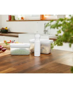 Contenitori per sottovuoto leggeri e indistruttibili per una conservazione impilabile salva-spazio di cibo e pietanze in frigo e in freezer. Quando non vengono utilizzati, i contenitori in plastica possono essere conservati l’uno dentro l’altro in un pensile della cucina.
